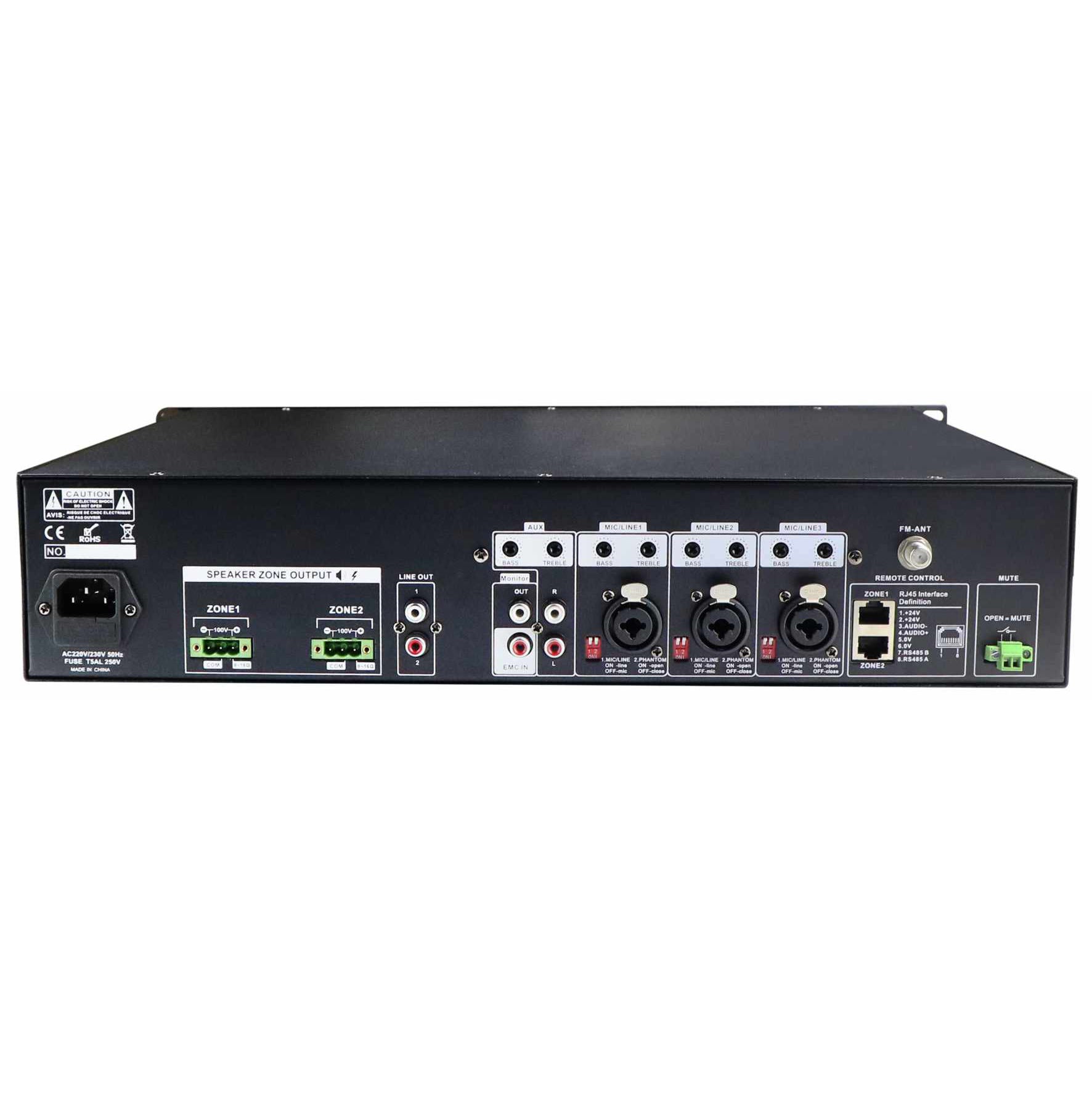Amplificador profissional de 2 zonas com módulo DAB integrado, leitor MP3, bluetooth. Conexőes de 70V, 100V, 4 Ohm e 8... Leer más...