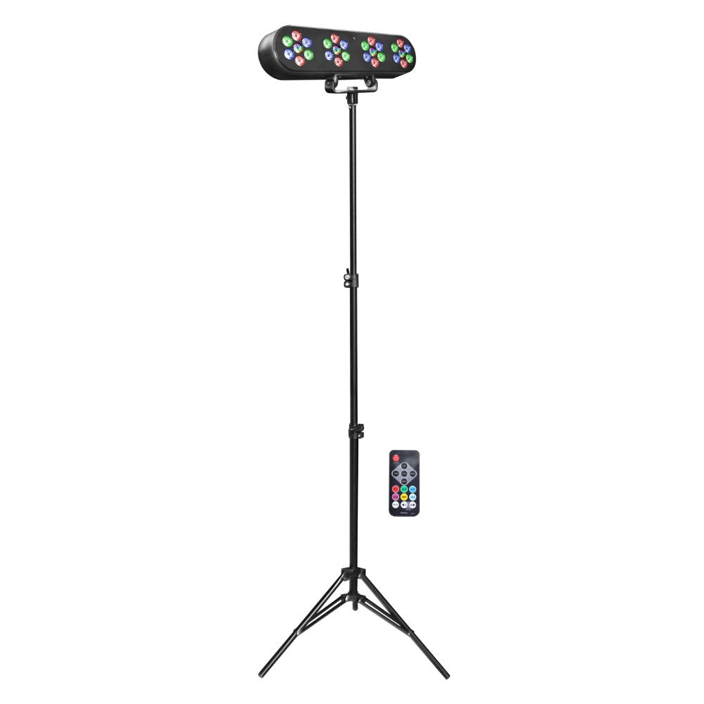 Efeito de luz transportável com pequenas dimensões mas desempenho extraordinário. Inclui um suporte de tripé e uma barra com 4 iluminadores LED RGB, totalizando 28 LEDs de 1W. Basta ligar o cabo de alimentação à tomada elétrica doméstica e pressionar o botão traseiro para ativar o dispositivo. Os modos de funcionamento disponíveis são automático ou por tempo de música. Através do comando remoto incluído é possível controlar vários parâmetros, como cor, velocidade, efeito dimmer e strobo, tornando-o ideal para DJs, bandas, animação de festas e pequenos palcos.