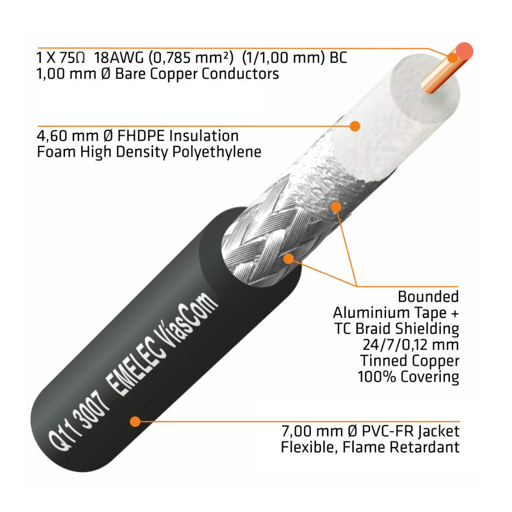 Cabo coaxial de alto desempenho, especialmente desenvolvido para a transmissão de sinais de vídeo HD-SDI, 3G-SDI e 4K-UHD, com excelente qualidade de sinal e elevada resistência mecânica. Ideal para instalações profissionais que exigem fiabilidade, proteção eletromagnética e integridade de sinal em curtas, médias ou longas distâncias.