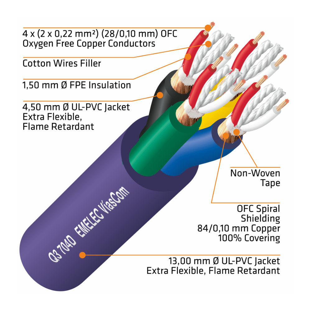 - Condutor em OFC - Cobre Livre de Oxigénio com secção de 0,22 mm², garantindo baixa resistência e excelente qualidade de sinal.