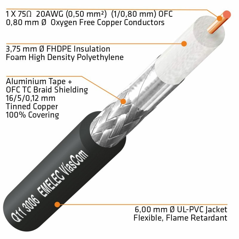 Os cabos utilizam cobre BC (Cobre Polido) no condutor, dielétrico de espuma de polietileno de alta densidade que permite uma velocidade de propagação do sinal superior e uma atenuação reduzida, blindagem de alta cobertura e revestimento em PVC-FR flexível ignífugo.