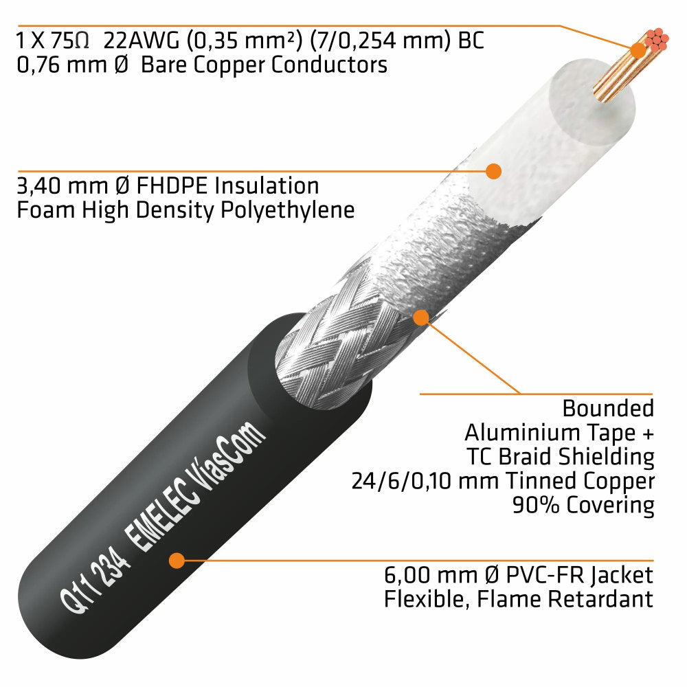 Carretel equipado com nosso cabo de vídeo digital Q11-234 preparado para transmitir sinais em resoluções de até 4K-UHD a 60 fps com nosso conector CC912 ou resoluções Full HD de até 1080p 60 fps com nosso conector CC812. Cabo com condutor multipolar, 100% blindado com fita de alumínio e trança de cobre estanhado. O revestimento externo usa um PVC forte e altamente flexível. Os condutores de cobre polido, a blindagem 100% e a qualidade do BNC utilizado garantem a perfeita transmissão da imagem. Ideal para aplicações fixas e móveis.