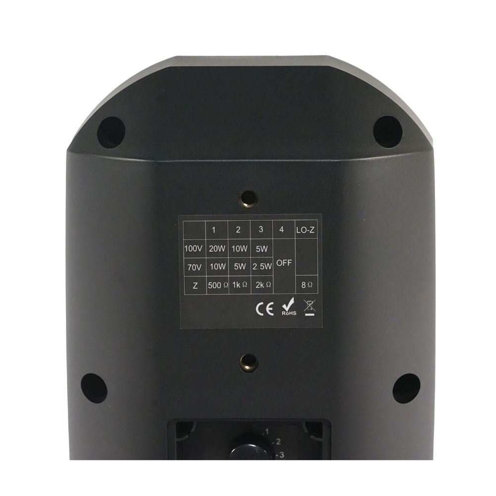 Colunas para todas as condições climáticas, para música e voz/fala, com acabamento à prova d'água IP66, caixa em ABS, grelha de metal inoxidável e suporte. Pode operar em 70/100 V ou 8 Ohm – disponível nas cores branca e preta.