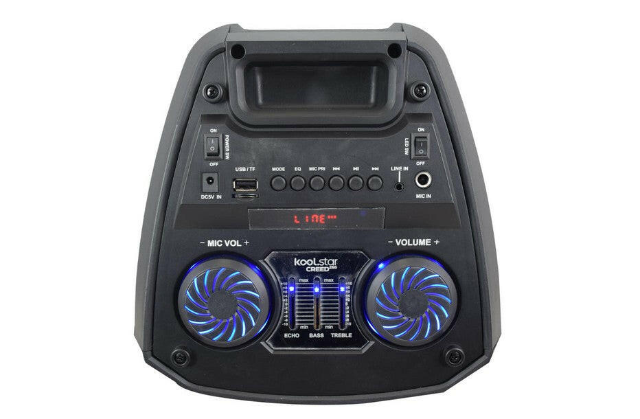 Coluna em formato de torre com woofer duplo de 6,5" iluminado por duas coroas de LED que mudam de cor com efeitos. Vem com controlo remoto e microfone para reproduzir voz durante aulas / conferências e para karaoke. Com receptor bluetooth permite reproduzir áudio de smartphones. O leitor de MP3 integrado lê músicas de pens e cartões micro SD. A bateria interna permite uma autonomia de 4 horas. Existe ainda uma ficha AUX para sinais externos.