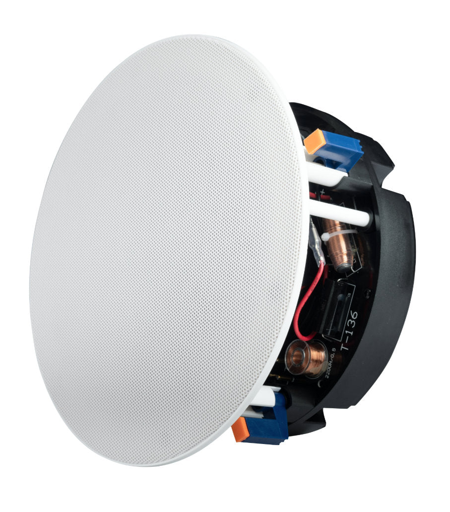Está equipado com um woofer de 6,5" e um tweeter de 1", garantindo um som equilibrado e nítido em todas as frequências. A grelha, sem bordas visíveis, fixa-se ao difusor através de ímãs, proporcionando uma instalação discreta e elegante.