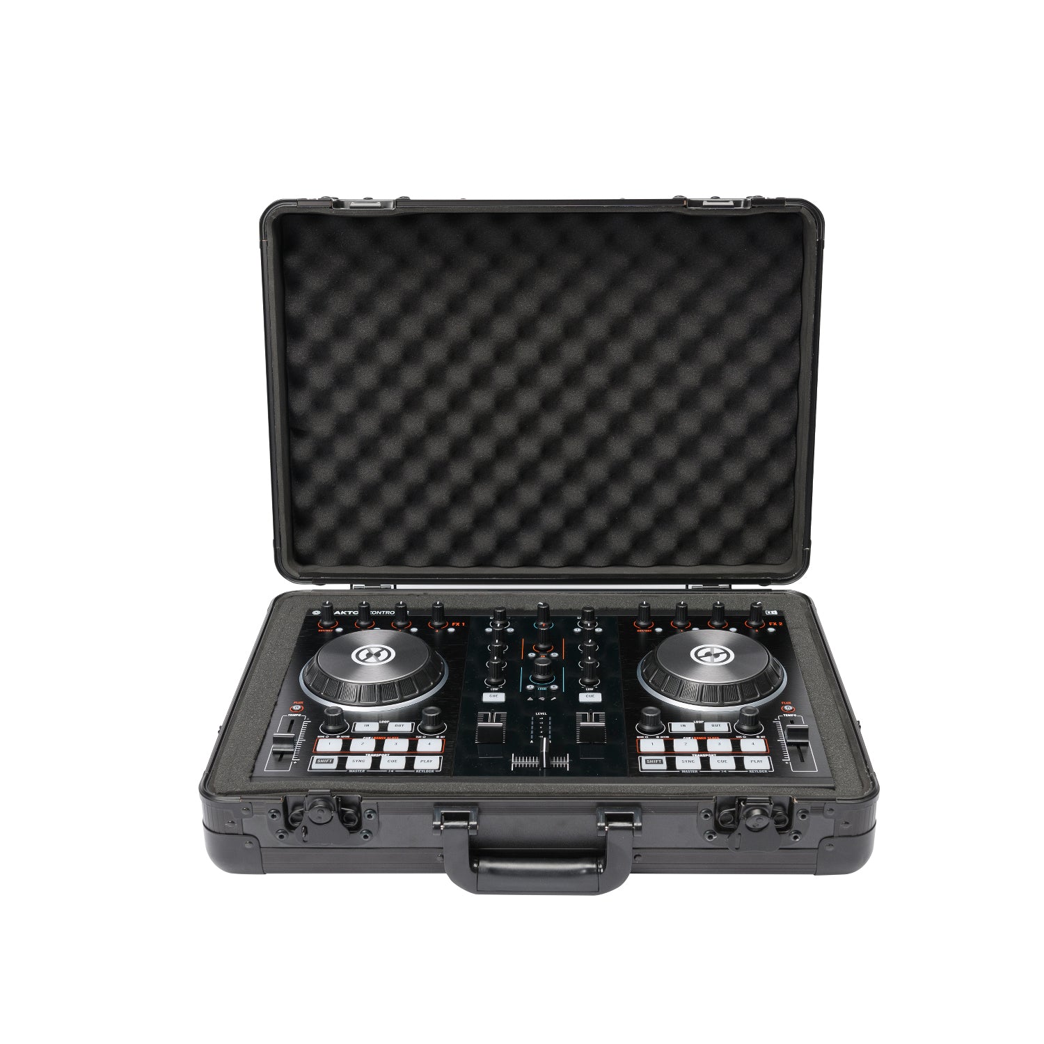 Caixa controladora de tamanho médio. Construção em MDF laminado e perfis de alumínio anodizado, com fechaduras borboleta (pode ser fixado com cadeado). Interior totalmente acolchoado com espuma EVA de 5 mm e espuma em relevo de 3 cm de espessura na tampa. Inclui peças de espuma de 2,5 e 3,5 cm para criar compartimentos para controladores, misturadores de batalha, portáteis ou pequenos acessórios. Alça de transporte confortável e opção para adicionar uma correia. Medidas: exterior 37,5 x 51 x 16 cm, interior 33 x 48 x 11 cm. Peso: 3.5 kg