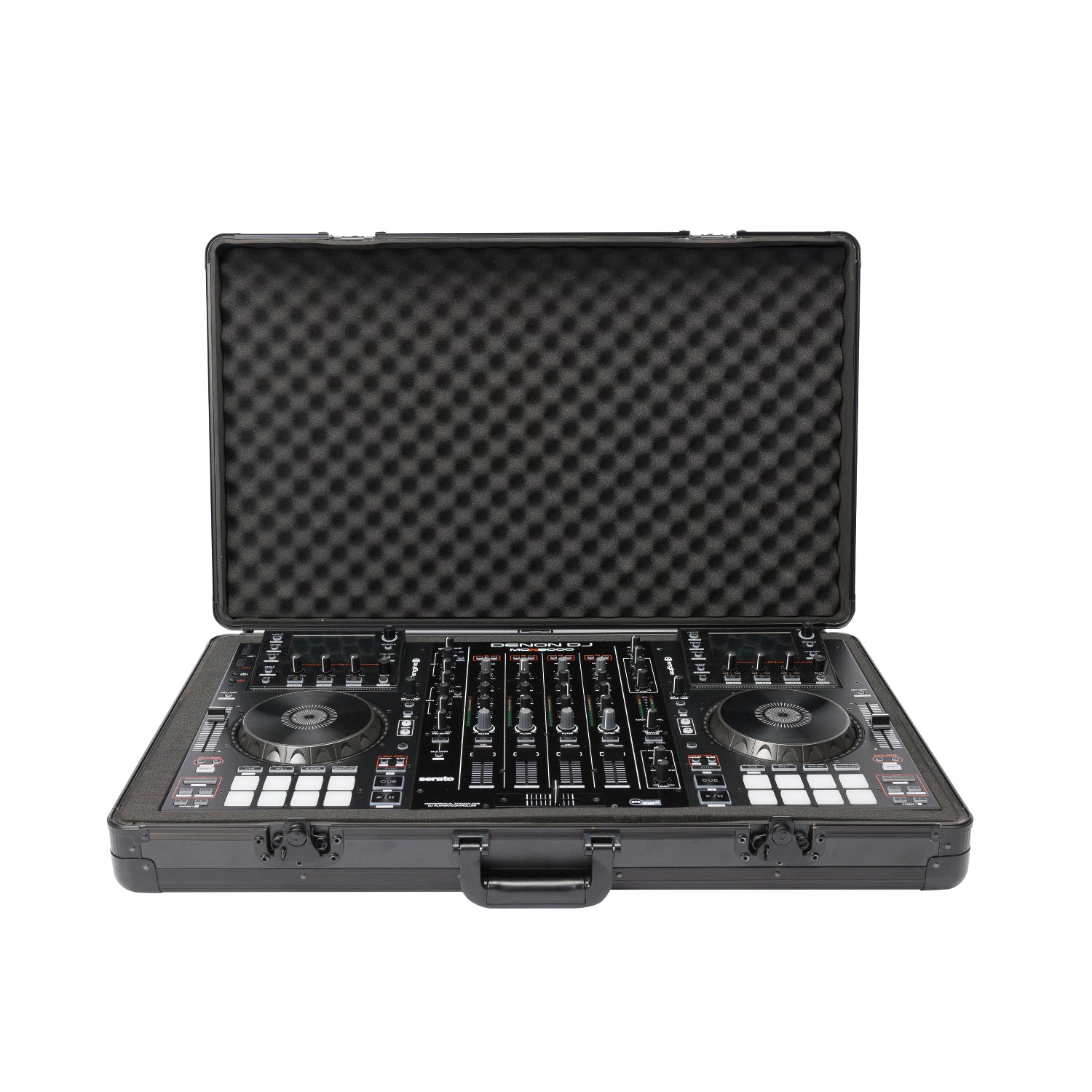 Caixa do controlador de tamanho extragrande. Construção em MDF laminado e perfis de alumínio anodizado, com fechaduras borboleta (pode ser fixado com cadeado). Interior totalmente acolchoado com espuma EVA de 5 mm e espuma em relevo de 3 cm de espessura na tampa. Inclui peças de espuma de 2,5 e 3,5 cm para criar compartimentos para controladores, misturadores de batalha, portáteis ou pequenos acessórios. Alça de transporte confortável e opção para adicionar uma correia. Medidas: exterior 50 x 80 x 16 cm, interior 46,5 x 77 x 11 cm. Peso: 6.3 kg