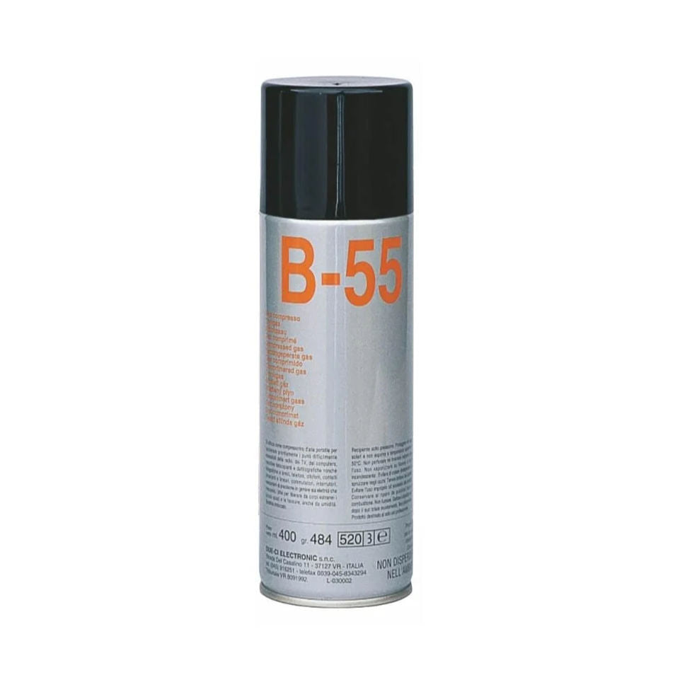 Ideal para remover pó e humidade em qualquer mecanismo ou peça onde não podemos usar solventes, o B-55 é uma mistura de gás inflamável e ecologicamente correto e compatível para uso com qualquer tipo de material, pois é ideal para remover pó em instrumentos de precisão, equipamentos de laboratório, sensores de câmera CCD e CMOS, fibras ópticas, câmeras, etc.