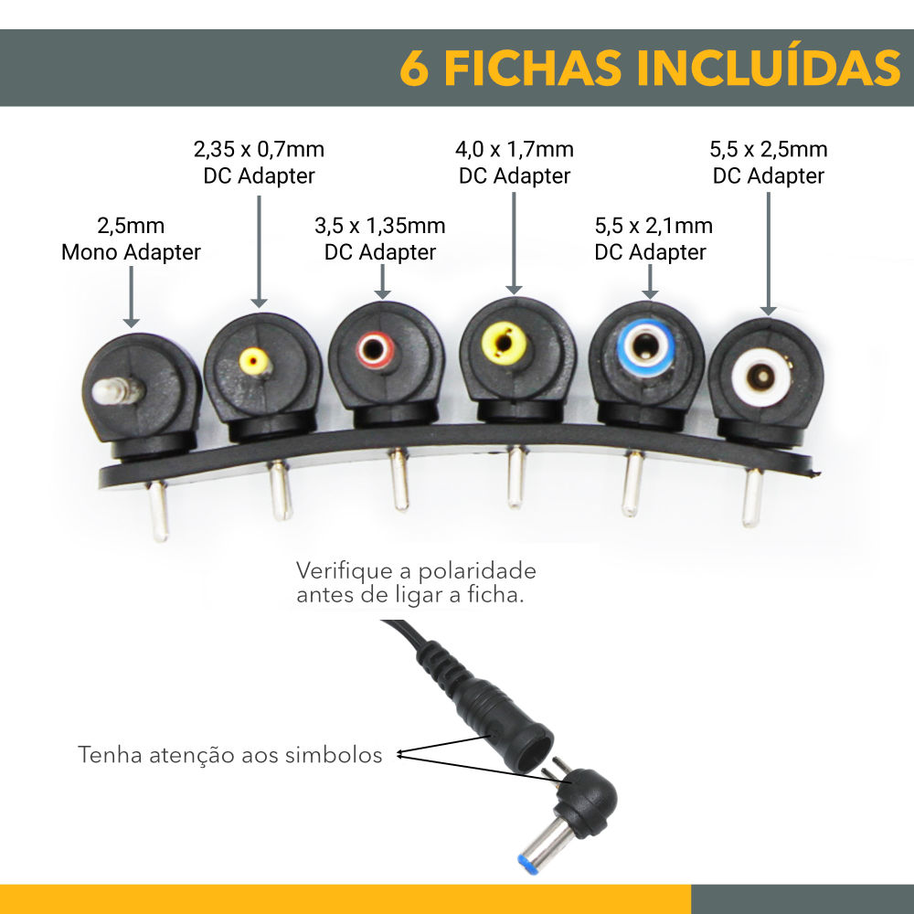Alimentador regulável, de alta qualidade, de 3V a 12V com 8 pontas entre as quais uma ponta USB fêmea, extremamente prática para ligar dispositivos que utilizem este tipo de ficha. Possui proteção contra sobredimensionamento, voltagem a mais, curto-circuito.