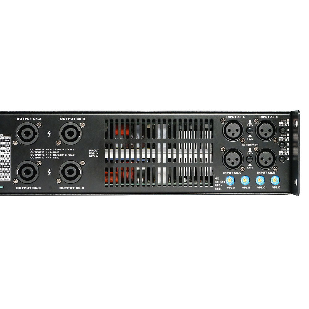 Amplificador classe D de alto desempenho de 4 canais, 4 x1500 w/8ohms, 4 x3000w/4 ohms, entrada XLR, saída speakon, medidor VU led, ventiladores de controle de temperatura, resposta de frequência 20Hz - 34Kz, VPL ajustável, 13kg.