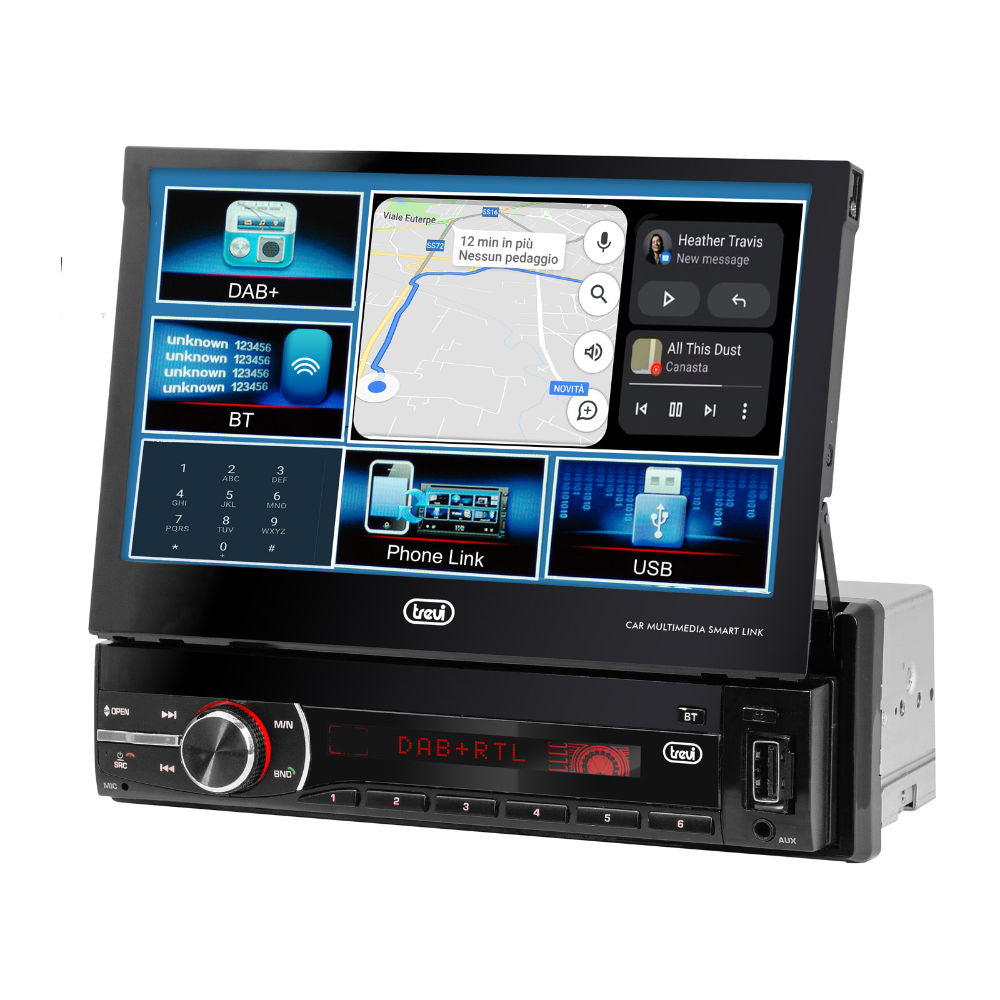 O autorrádio Trevi está equipado com um sintonizador DAB/DAB+/FM RDS com 18 memórias, um ecrã LCD tátil de 7" graças ao qual pode visualizar confortavelmente todas as funções e entradas USB, SD e AUX IN para ligar qualquer tipo de leitor externo. Além disso, através da ligação sem fios , pode também ligar o seu smartphone ao autorrádio e utilizá-lo tanto para ouvir as suas listas de reprodução de música favoritas como para efetuar conversas telefónicas em modo mãos-livres enquanto conduz de forma confortável e segura.