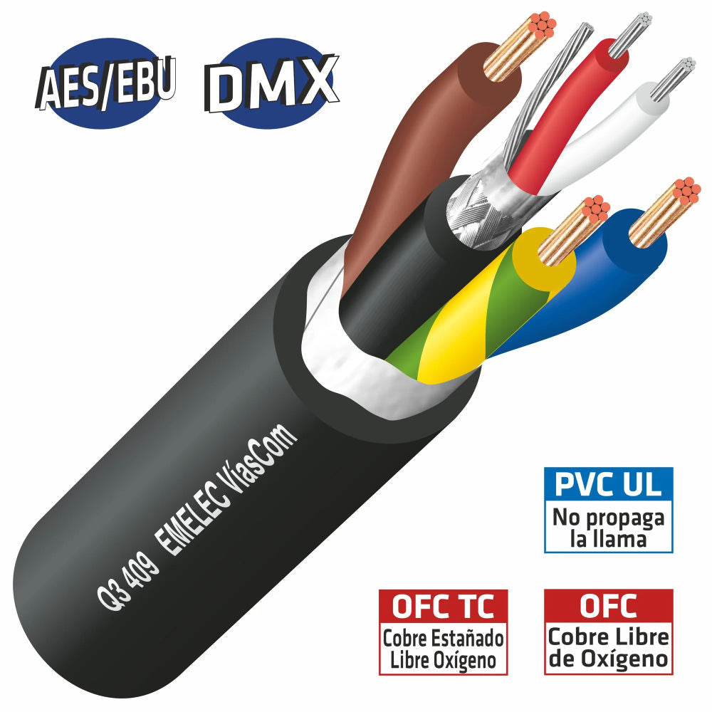 -O par balanceado foi concebido para a transmissão de sinais digitais segundo as normas AES/EBU e DMX com uma impedância caraterística de 110 Ohm constante e estável em todo o percurso.
