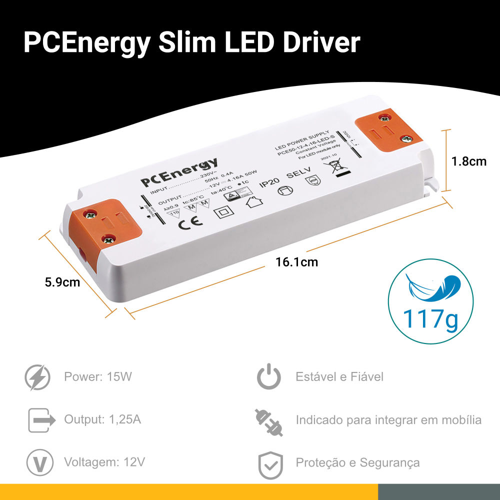 Led DriverTensão de saída: 12VCorrente de saída: 4,1APotência: 50WEntrada: 100-240V ~ 50/60Hz; 0,4A máx.Sem consumo de energia de carga: <0,5WProteção:... Ler mais