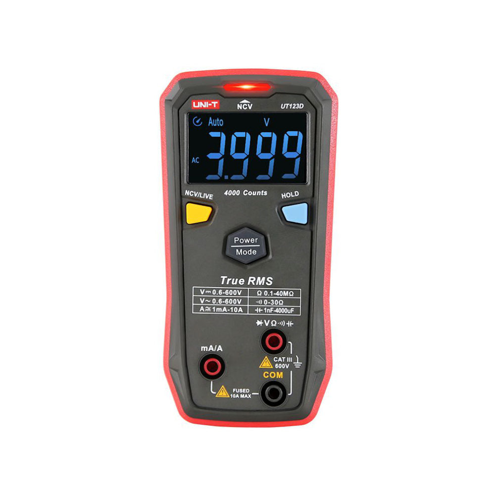 Uma nova inovaçăo da UNI-T: o multímetro True RMS UT123D. Pode identificar e medir automaticamente tensăo AC/DC, corrente AC/DC, resistęncia e capacitância com o pressionar de um único botăo. O design compacto e o display EBTN com 4000 contagens tornam-no uma ótima ferramenta para casa, bricolagem e trabalho em ambientes escuros. A funçăo de retençăo de dados evita a necessidade de realizar mediçőes duplas desnecessárias e o recurso de desligamento automático economiza o uso da bateria. Para diversas funçőes de mediçăo, o multímetro digital inteligente fornece sinais acústicos e visuais adicionais através de sua campainha e indicador LED colorido.