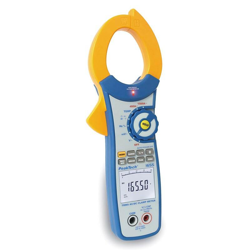 Pinça amperométrica digital profissional para medições até 1500 A CA/CC com caixa robusta em borracha e ergonómica que garante um manuseio seguro durante a medição e também adequada para uso em aplicações industriais. O detector de tensão integrado permite a detecção de fios ativos e a garra amperimétric inclui a função de medição de corrente de arranque para medir as correntes máximas, ou seja, de motores elétricos.