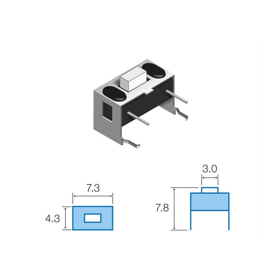 Contatos: 12Vdc/50mAPressão de trabalho: 180 +/- 30gfResistência: 100Mohm. máx.Tamanho: 7,3 x 4,3 mm, distância do pino ao botão de pressão... Ler mais