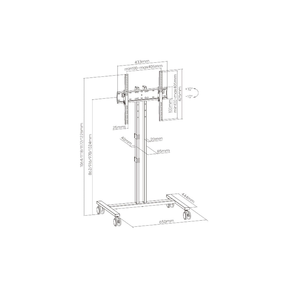 As rodas deste suporte para televisor são grandes e flexíveis e não arranham o chão quando se deslocam. O suporte pode acomodar ecrãs de 34" a 55" com um ângulo de inclinação de -10° a +10° para evitar reflexos incómodos.